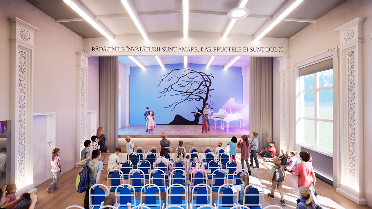 reimaginată într-un concept modern și funcțional, cu accente muzicale și clasice, scenă deschisă, lumină contemporană și portretul lui Mihai Eminescu ca simbol central.